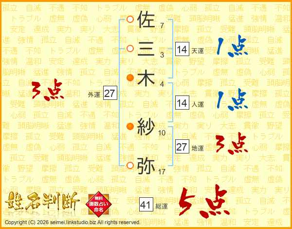 佐(7画)三(3画)木(4画) 紗(10画)弥(17画)