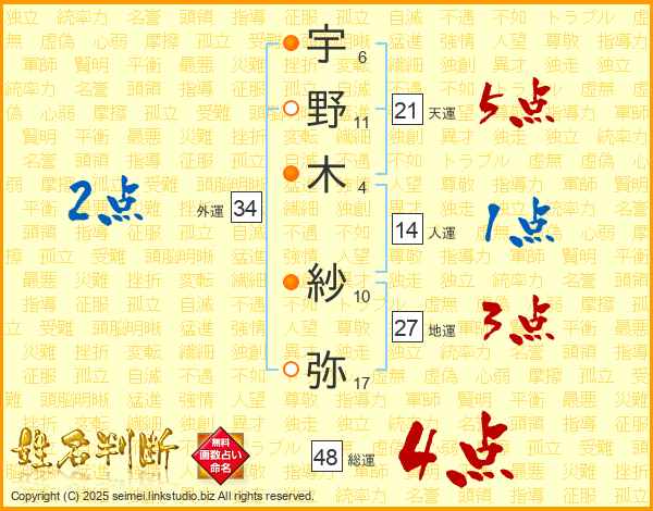 宇(6画)野(11画)木(4画) 紗(10画)弥(17画)