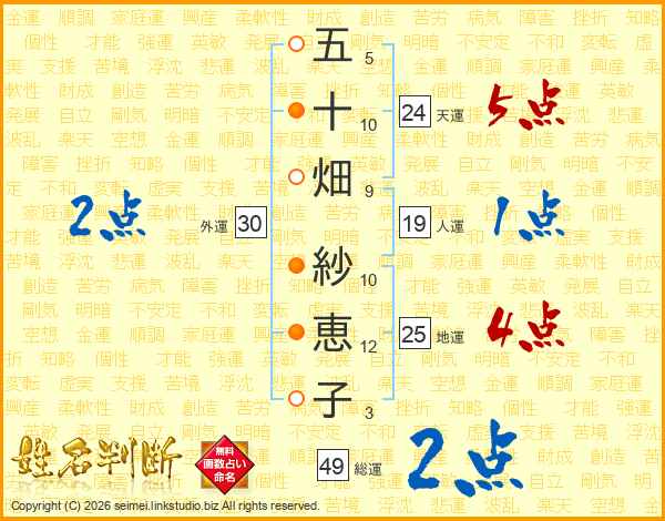 五(5画)十(10画)畑(9画) 紗(10画)恵(12画)子(3画)