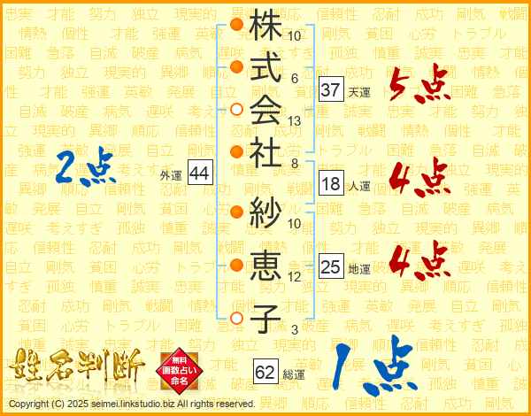 株(10画)式(6画)会(13画)社(8画) 紗(10画)恵(12画)子(3画)