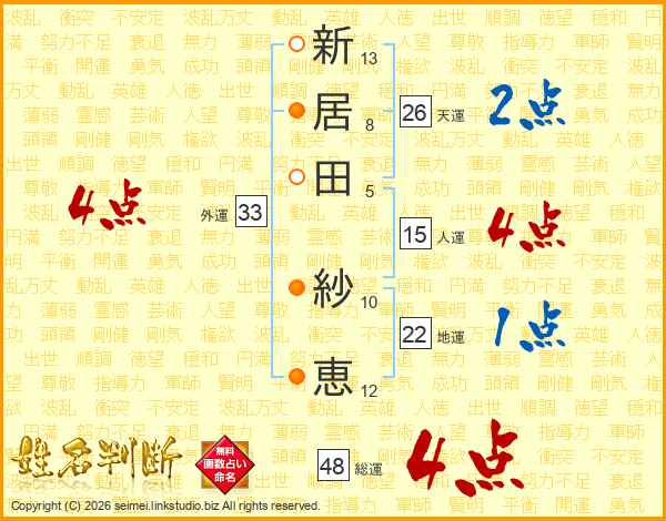 新(13画)居(8画)田(5画) 紗(10画)恵(12画)