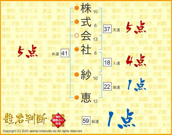 株(10画)式(6画)会(13画)社(8画) 紗(10画)恵(12画)