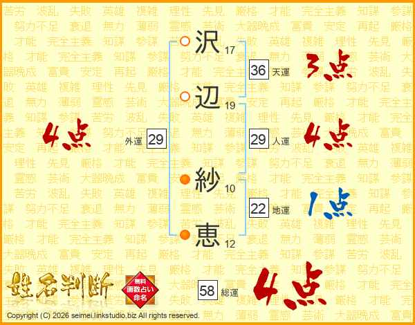 沢辺紗恵さんの総運は58画の4点!