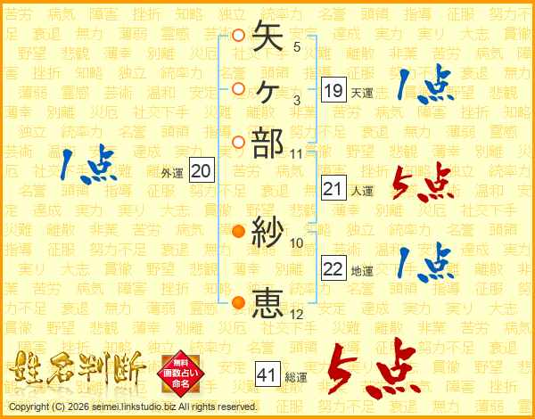 矢(5画)ヶ(3画)部(11画) 紗(10画)恵(12画)