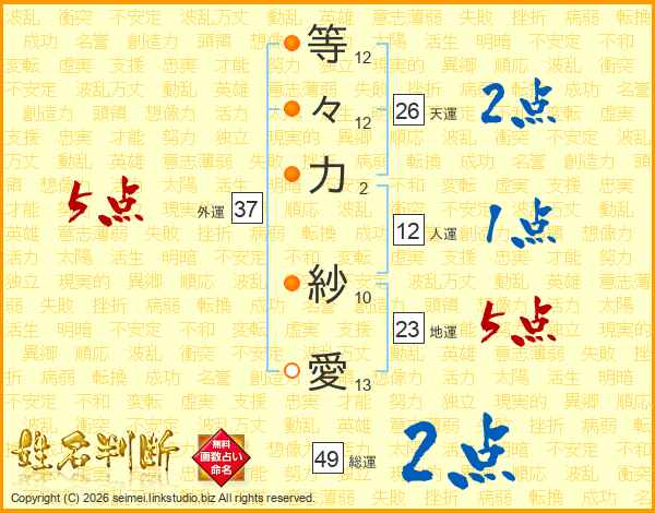 等(12画)々(12画)力(2画) 紗(10画)愛(13画)