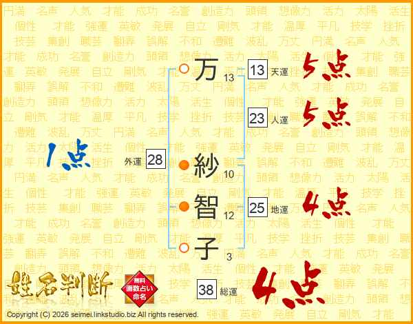 万(13画) 紗(10画)智(12画)子(3画)