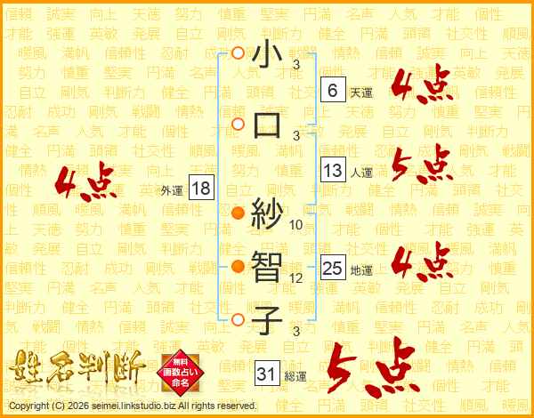 小(3画)口(3画) 紗(10画)智(12画)子(3画)