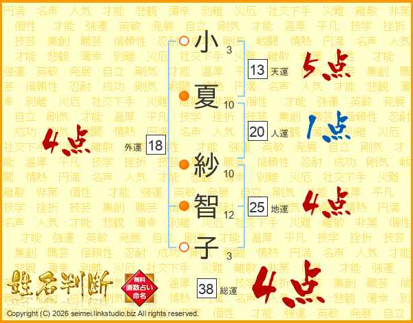小夏紗智子さんの総運は38画の4点!