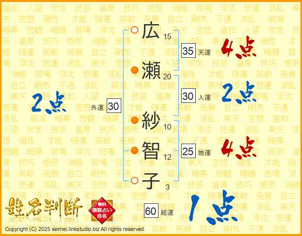 広(15画)瀬(20画) 紗(10画)智(12画)子(3画)