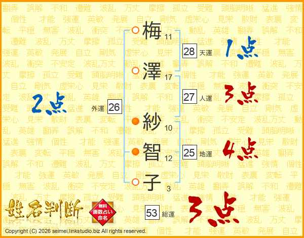 梅(11画)澤(17画) 紗(10画)智(12画)子(3画)