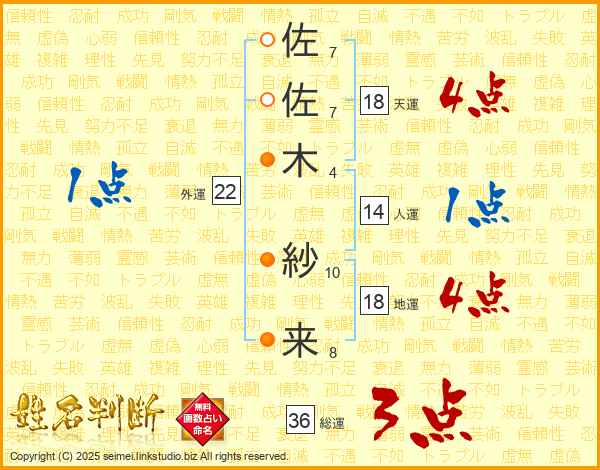 佐(7画)佐(7画)木(4画) 紗(10画)来(8画)