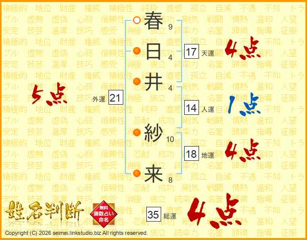 春(9画)日(4画)井(4画) 紗(10画)来(8画)