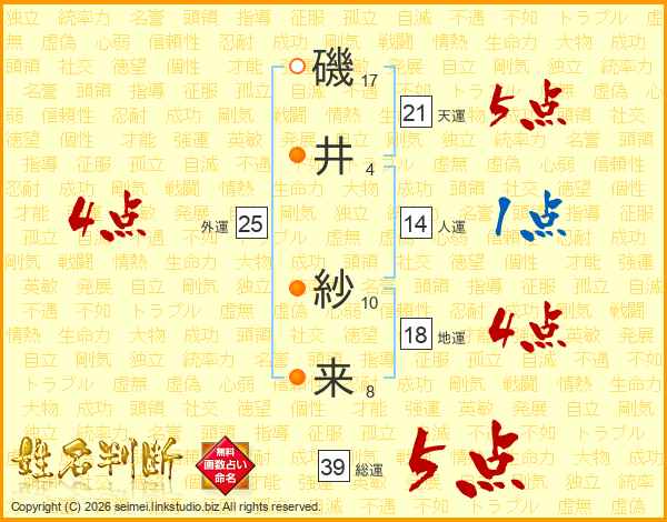 磯(17画)井(4画) 紗(10画)来(8画)