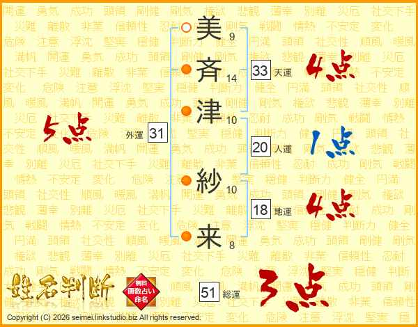 美(9画)斉(14画)津(10画) 紗(10画)来(8画)