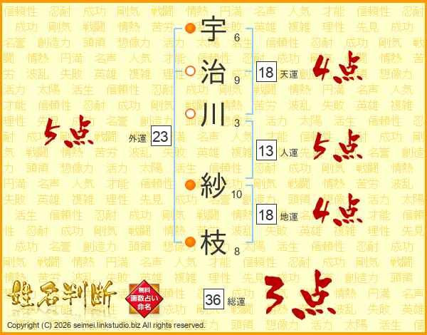 宇(6画)治(9画)川(3画) 紗(10画)枝(8画)
