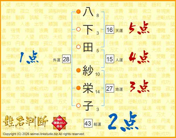 八下田紗栄子さんの総運は43画の2点!