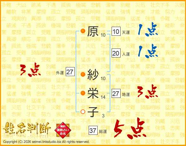 生活面を象徴する運勢です。外部から受ける影響力を表し、結婚運、家庭運や職場、環境への順応性を表します。総運から人運を引いた画数。姓や名が1文字の場合を除く。