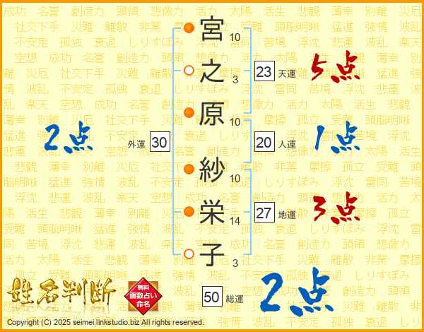 宮(10画)之(3画)原(10画) 紗(10画)栄(14画)子(3画)