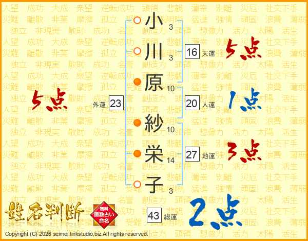 小(3画)川(3画)原(10画) 紗(10画)栄(14画)子(3画)
