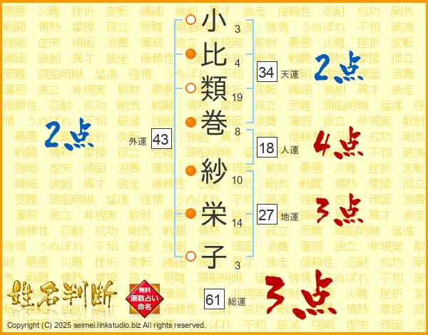 小(3画)比(4画)類(19画)巻(8画) 紗(10画)栄(14画)子(3画)