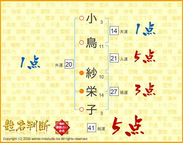 小鳥紗栄子さんの総運は41画の5点!