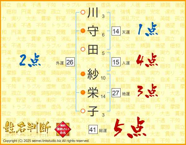 川(3画)守(6画)田(5画) 紗(10画)栄(14画)子(3画)