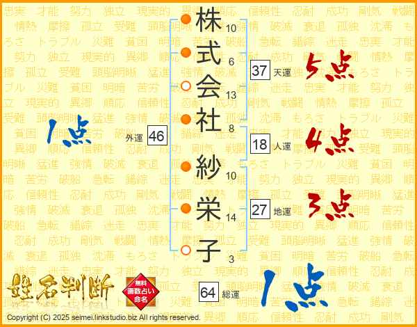 株式会社紗栄子さんの天運は37画の5点!