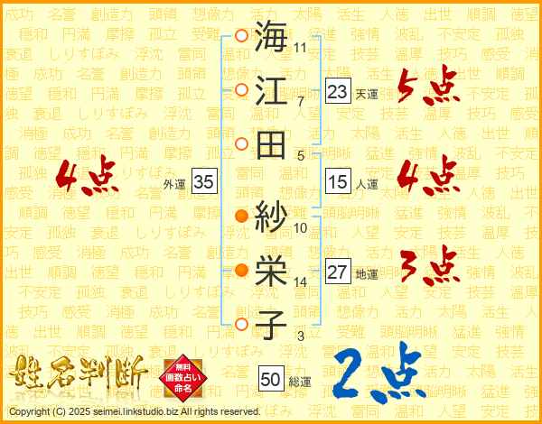 海(11画)江(7画)田(5画) 紗(10画)栄(14画)子(3画)