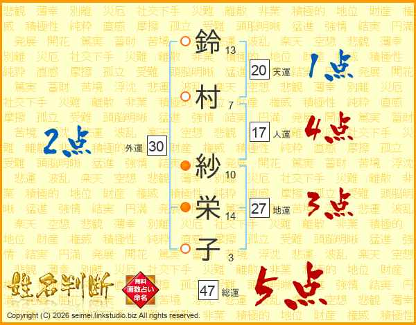鈴(13画)村(7画) 紗(10画)栄(14画)子(3画)