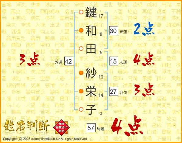 鍵(17画)和(8画)田(5画) 紗(10画)栄(14画)子(3画)