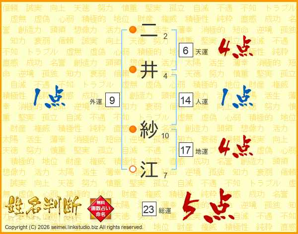 生活面を象徴する運勢です。外部から受ける影響力を表し、結婚運、家庭運や職場、環境への順応性を表します。総運から人運を引いた画数。姓や名が1文字の場合を除く。