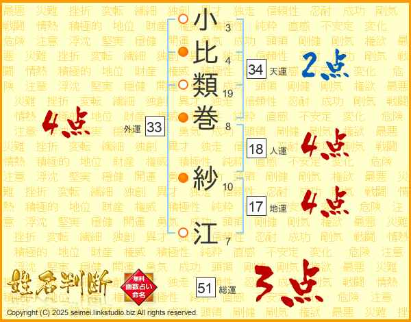 小(3画)比(4画)類(19画)巻(8画) 紗(10画)江(7画)