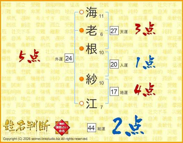 海(11画)老(6画)根(10画) 紗(10画)江(7画)