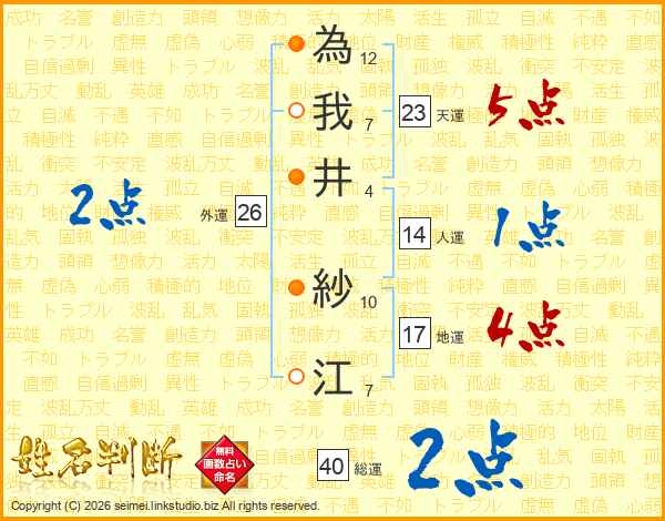 為(12画)我(7画)井(4画) 紗(10画)江(7画)