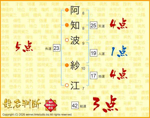 阿(8画)知(8画)波(9画) 紗(10画)江(7画)