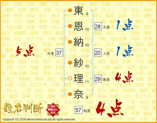 東(8画)恩(10画)納(10画) 紗(10画)理(11画)奈(8画)