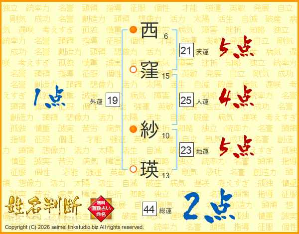 西窪紗瑛さんの総運は44画の2点!