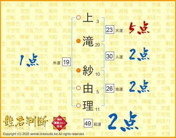 上(3画)滝(20画) 紗(10画)由(5画)理(11画)