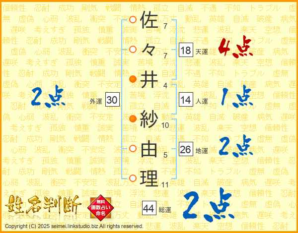 佐(7画)々(7画)井(4画) 紗(10画)由(5画)理(11画)