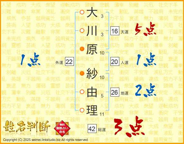 大(3画)川(3画)原(10画) 紗(10画)由(5画)理(11画)