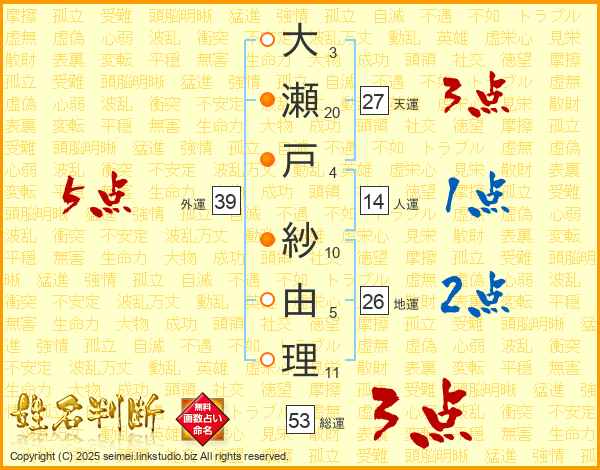 大(3画)瀬(20画)戸(4画) 紗(10画)由(5画)理(11画)