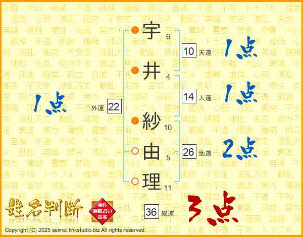 宇(6画)井(4画) 紗(10画)由(5画)理(11画)