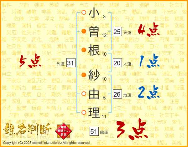 小(3画)曽(12画)根(10画) 紗(10画)由(5画)理(11画)