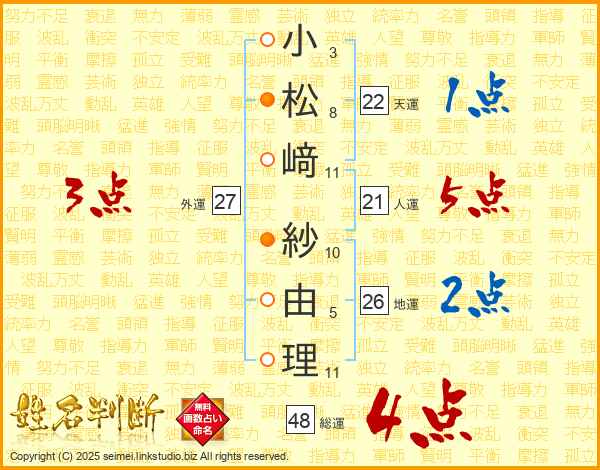 小(3画)松(8画)﨑(11画) 紗(10画)由(5画)理(11画)