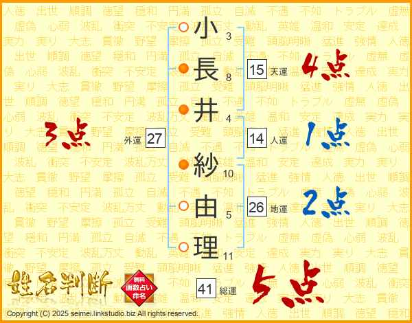 小(3画)長(8画)井(4画) 紗(10画)由(5画)理(11画)