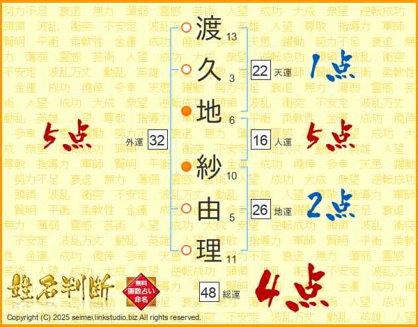 渡(13画)久(3画)地(6画) 紗(10画)由(5画)理(11画)
