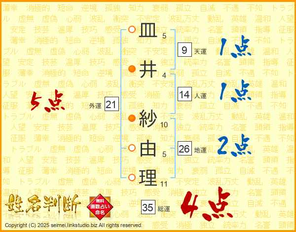 皿(5画)井(4画) 紗(10画)由(5画)理(11画)
