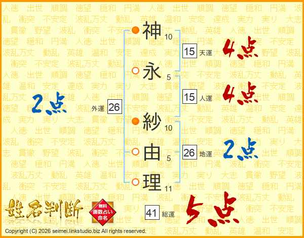 神(10画)永(5画) 紗(10画)由(5画)理(11画)