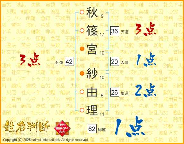 秋(9画)篠(17画)宮(10画) 紗(10画)由(5画)理(11画)