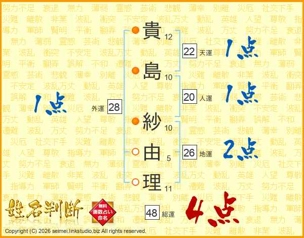 貴(12画)島(10画) 紗(10画)由(5画)理(11画)